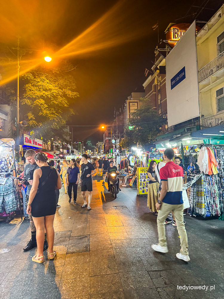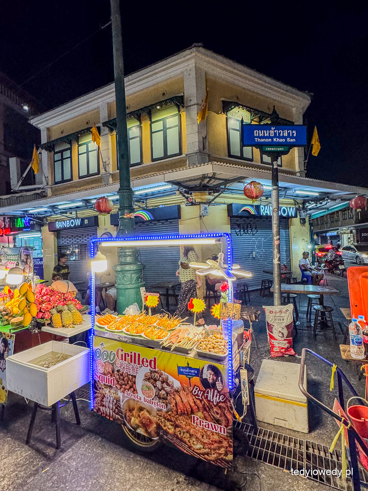 Poprzednio nie udało nam się dotrzeć do słynnej ulicy Khao San Road – uznawanej za mekkę backpackersów. To niedługa uliczka (410 m), wzdłuż której usytuowane są bary, restauracje, hostele, salony masażu, sklepy z pamiątkami itd. Wieczorami jest bardzo zatłoczona i tętni nocnym życiem. Na straganach sprzedawany jest oryginalny street food – m.in. insekty i krokodyle; huczy muzyka z klubów tanecznych, mnóstwo tu naganiaczy, pijanych turystów, hałas, tłok. Nie jest to nasz klimat – ale cieszymy się, że tam dotarliśmy, bo wiemy, że była to jednorazowa przygoda z naszej strony ;)