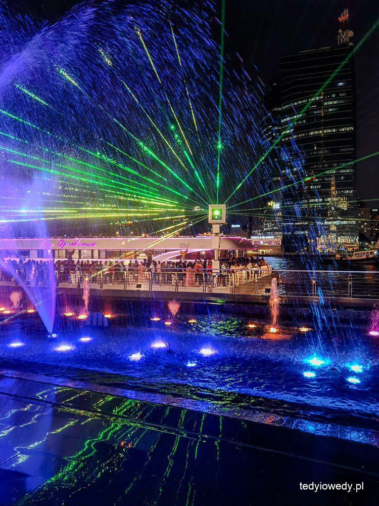 Na dolnym poziomie, tuż nad rzeką wieczorami odbywa się pokaz laserowy i tańczących fontann: