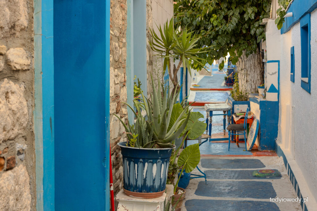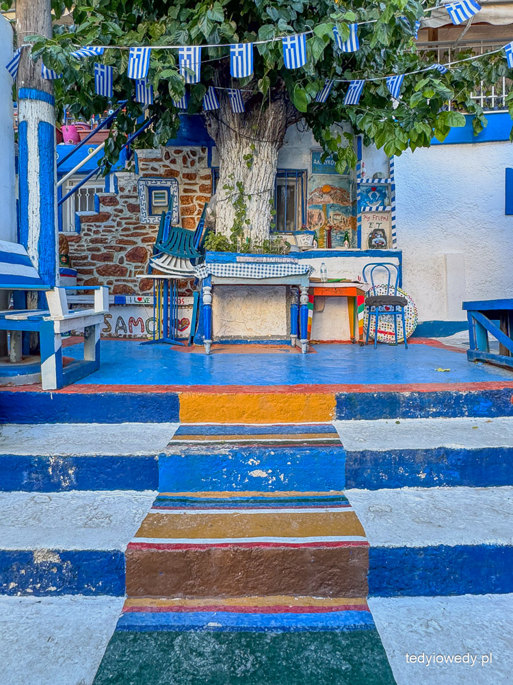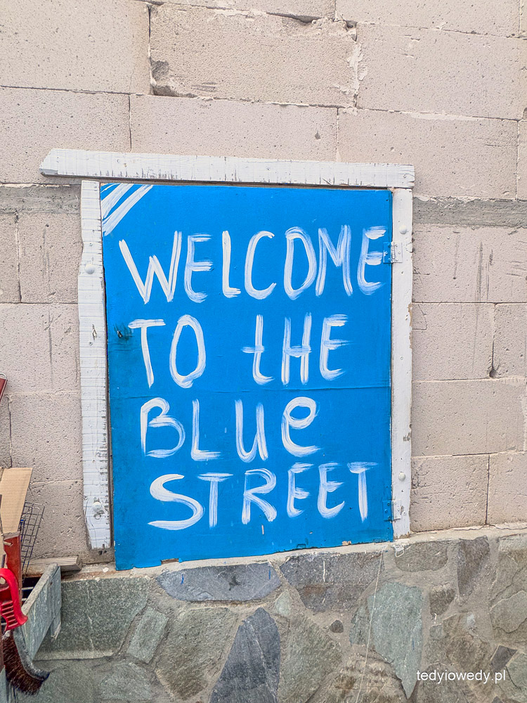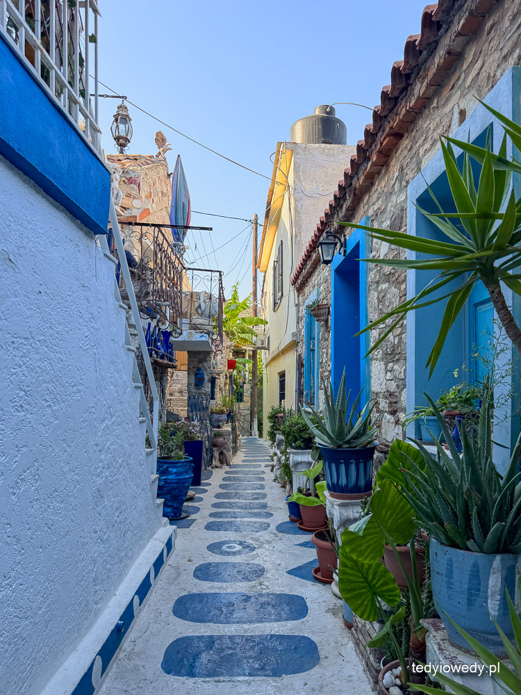 Miejscem, który odwiedzają wszyscy przybywający do Pitagorio jest tzw. Blue Street. To krótka uliczka, zaułek właściwie, położona między domami, niedaleko zamku. Mieszkańcy pomalowali sporo detali na niebiesko, postawili donice z roślinami, udekorowali wejścia do domów i powstał malutki, ale uroczy zakątek.