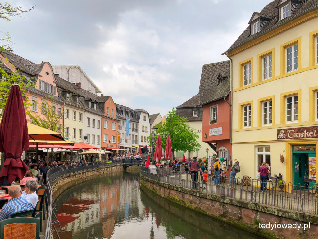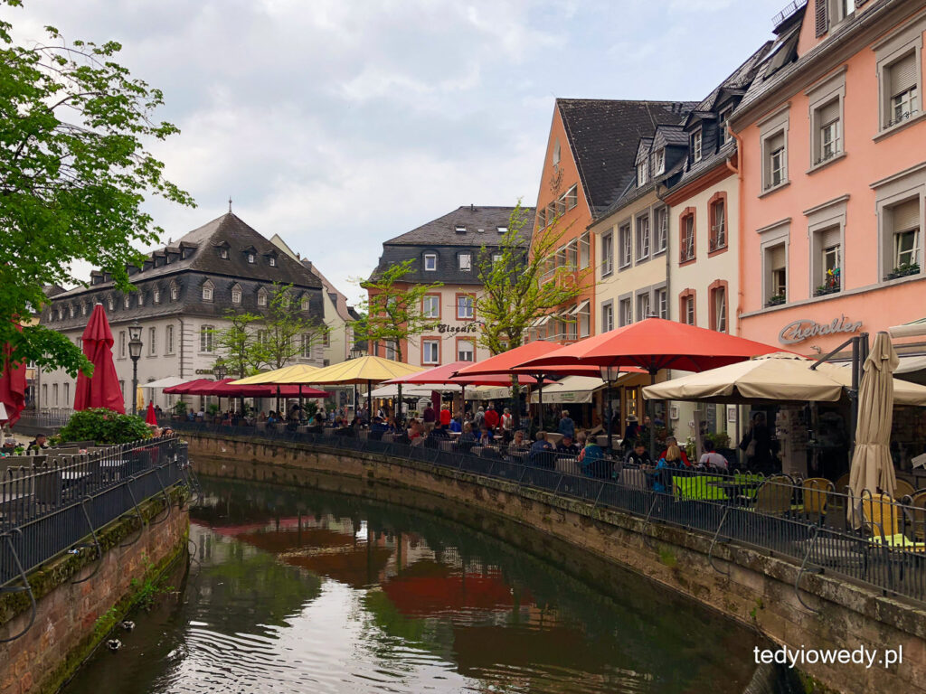Trewir, tak jak i inne miasta i miasteczka w Dolinie Mozeli, charakteryzuje się malowniczą szachulcową zabudową i słynie z pysznego wina. Trafiliśmy akurat na dzień targowy i poza klasycznymi wyrobami sprzedawanymi na straganach, można też było wypić w biegu lampkę miejscowego trunku. Centrum miasta jest bardzo zadbane, przyjemnością był spacer, zaglądanie w wąskie uliczki odchodzące od głównych tras i odkrywanie klimatycznych zaułków.